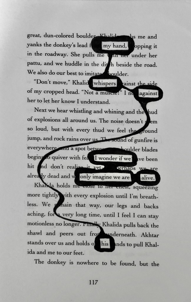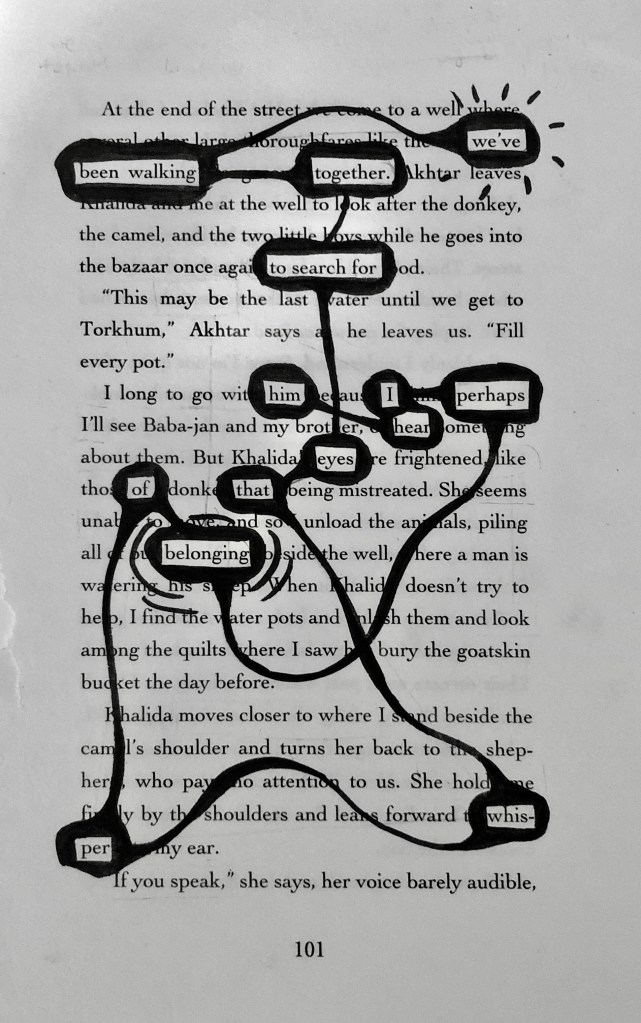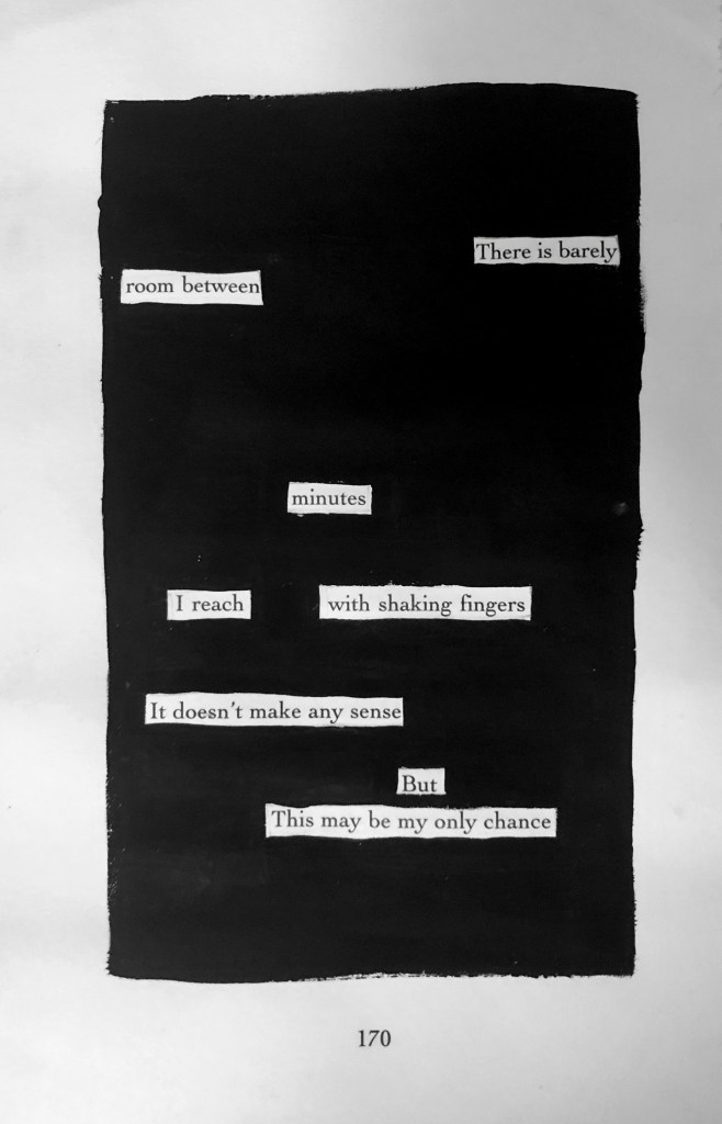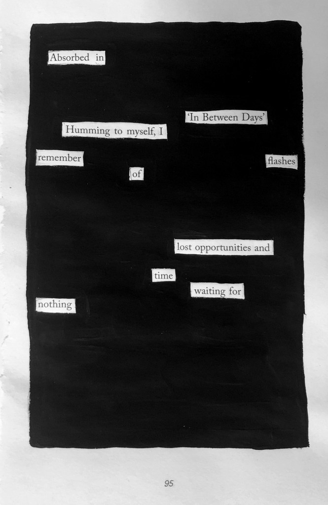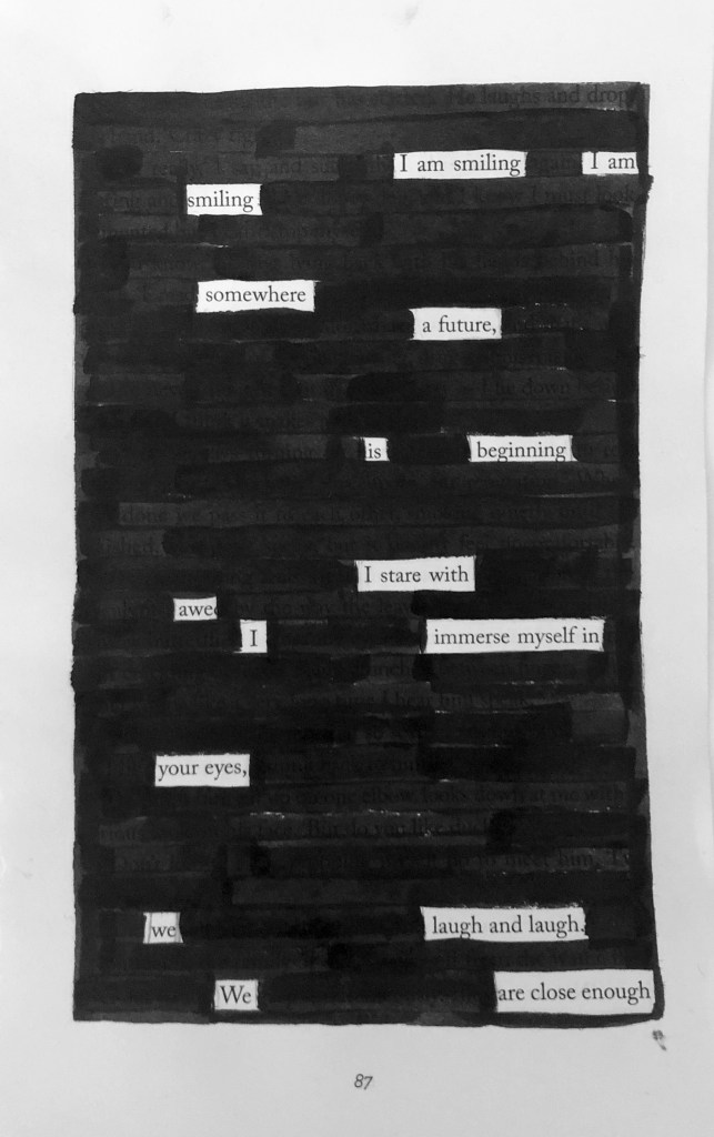 These are a few blackout poems I have created, some recently and some from a little while ago. I like doing these when I want to write something but don’t want to conjure something from the depths of my brain. It’s also an interesting restriction to place upon one’s creative capacity, because there are only certain words to choose from, it’s just about finding the right ones.